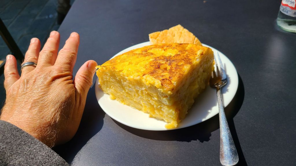 On the way I stopped for second breakfast at Essential Coffee. It’s a small and mighty trailside Cafe. I had my go-to protein boost (Tortilla Espanola) and cafe con leche. The Tortilla hit all the marks: it was warm, moist, and had thoughtful smaller bits of potato and — a first for me here — sautéed onion. It was super-delicious. And, it was served with a large (i.e., big enough to fill your palm) chunk of homemade, fresh, soft, and warm sourdough bread. It was divine. When I was getting ready to leave, I was paying my bill when the owner discreetly slid a napkin-coverwd chunk of sourdough bread across the counter to me. “You’ll need it for your hike today,” he said.